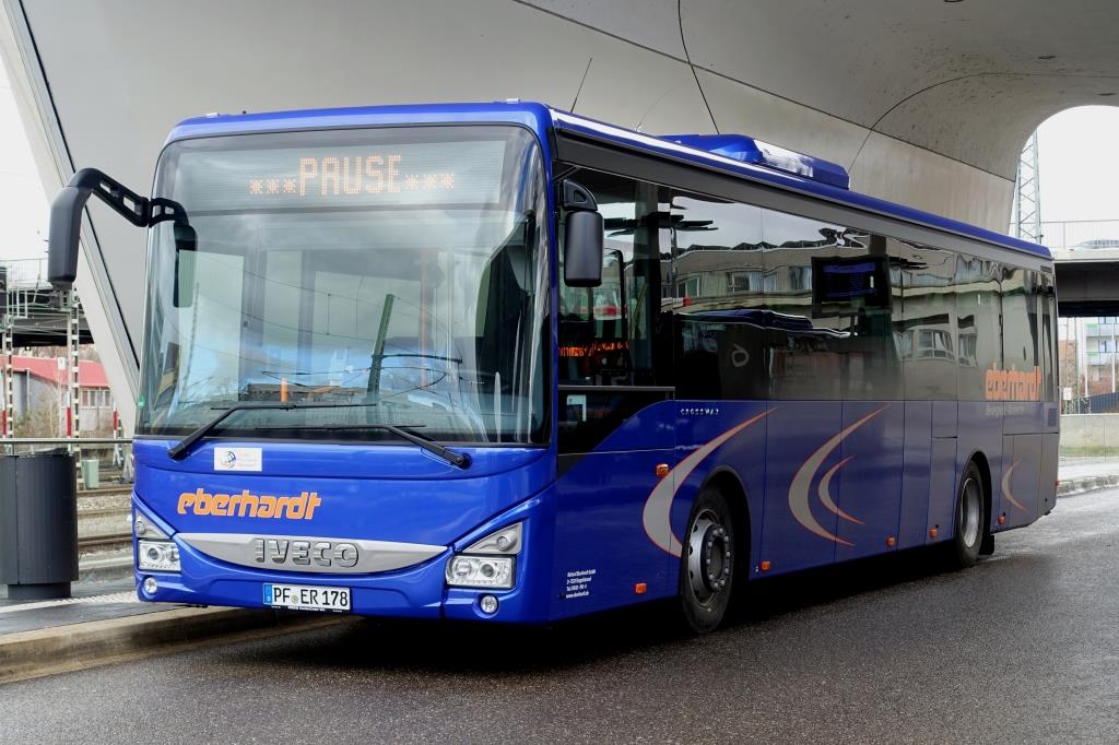 Der MB C2 hybrid 410 der STI am 17.2.21 auf dem Bahnhofplatz Thun.