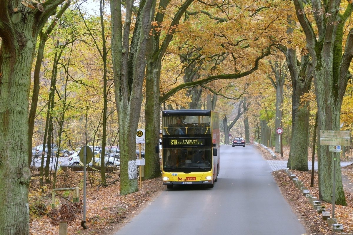 MAN Lion's City DD der BVG '3411' (DL08), ist auf der Linie 218 Richtung Pfaueninsel unterwegs. Berlin /Havelchausee im November 2018.