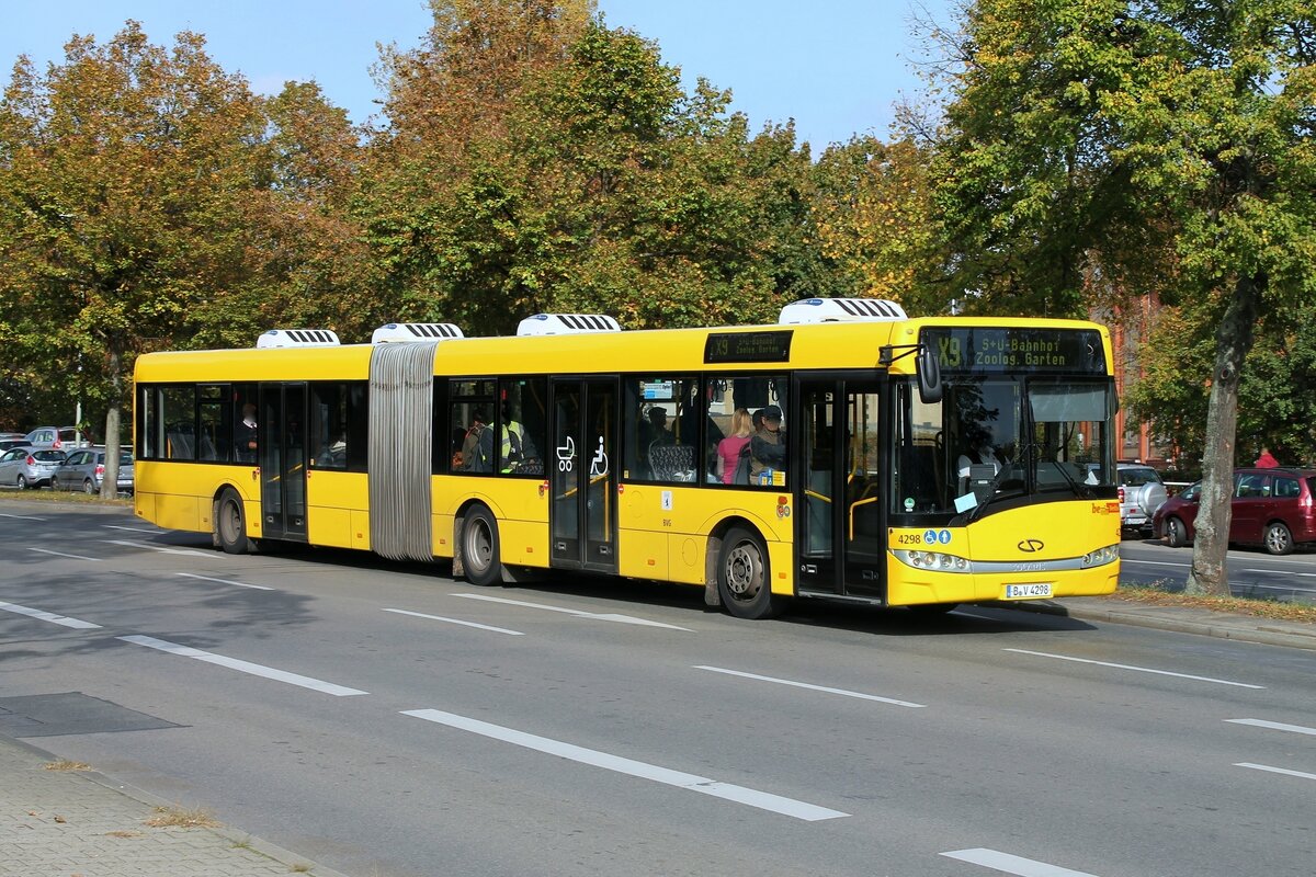 BVG Berlin, zum Betriebsende des Urbino 18, hier Wagen '4298' [GN07] auf dem X9 unterwegs durch Berlin, Oktober 2015. [Solaris] [Teil I]