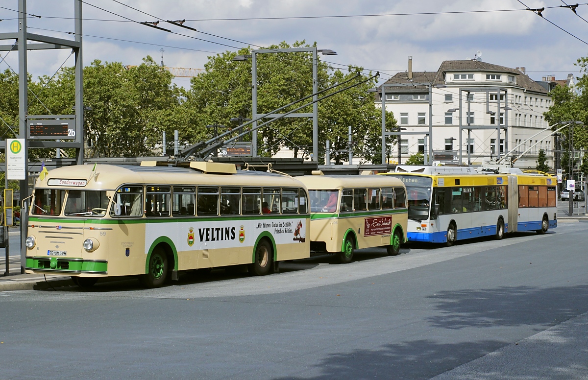 Am 12.09.2021 machte der ÜH IIIs 59 zusammen mit dem Orion WH112 06 des Obus-Museums Solingen seine monatliche Rundfahrt von/nach Ohligs über den Graf-Wilhelm-Platz und Wald, hier stehen die beiden Fahrzeuge abfahrbereit vor dem Hauptbahnhof