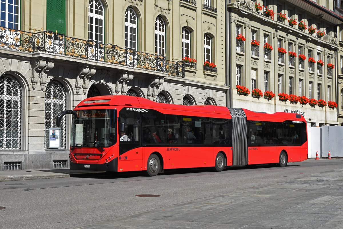 Volvo Hybridbus 228, auf der Linie 19, bedient am 04.10.2022 die Haltestelle auf dem Bundesplatz.