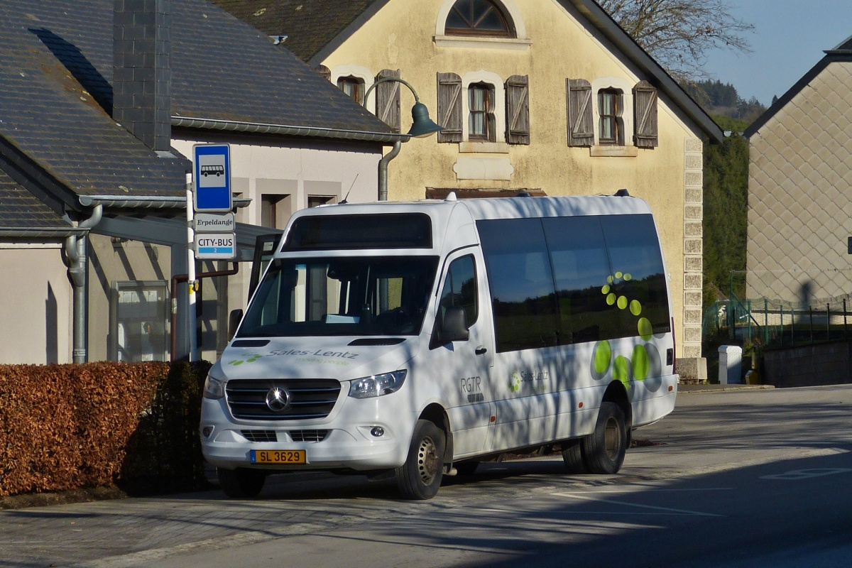SL 3629, Mercedes Benz Sprinter, von Sales Lentz, bedient die Strecke Wiltz - Dorscheid, hier an der Haltestelle in Erpeldange. 02.2022