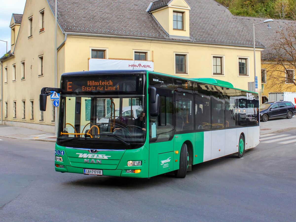 Graz. Am 05.10.2020 musste vorläufige der Betrieb auf der Straßenbahnlinie 1 eingestellt werden aufgrund eines Schadens an der Infrastruktur. Den Ersatzverkehr mussten allerdings Private übernehmen, da es bei den Graz Linien an Bussen mangelte. Eine Begegnung von MAN Lion`s Citys von Weiss ist hier in der Mariatroster Straße zu sehen.