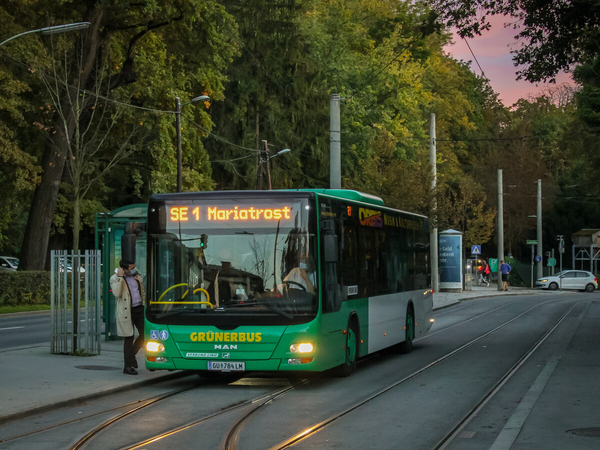 Graz. Am Abend des 07.10.2020 konnte ich einen MAN Lion's City von Grünerbus als SE1 beim Hilmteich ablichten.