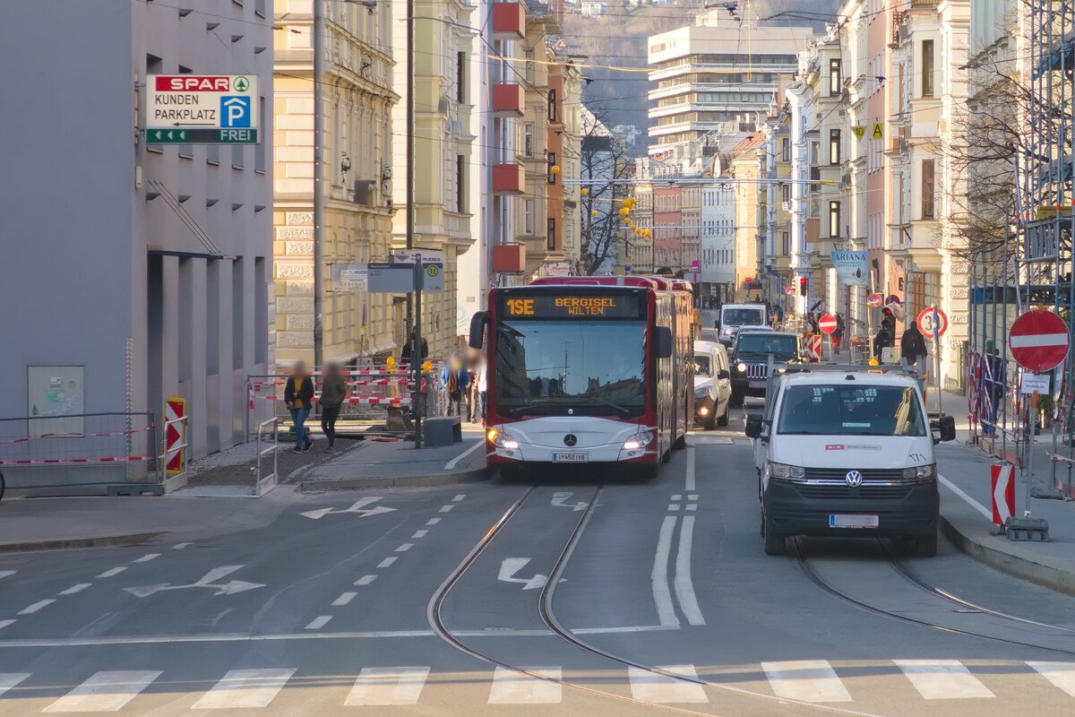 Innsbruck: Schienenersatzverkehr für die Straßenbahnlinie 1 (Linie 1SE), Bus Nr. 411 der Innsbrucker Verkehrsbetriebe ist über die Egger-Lienz-Straße umgeleitet. Aufgenommen 17.3.2022.