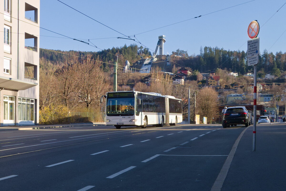 Innsbruck: Schienenersatzverkehr für die Straßenbahnlinie 1 (Linie 1SE), Bus Nr. 415 an der Haltestelle Bergisel. Aufgenommen 22.3.2022.