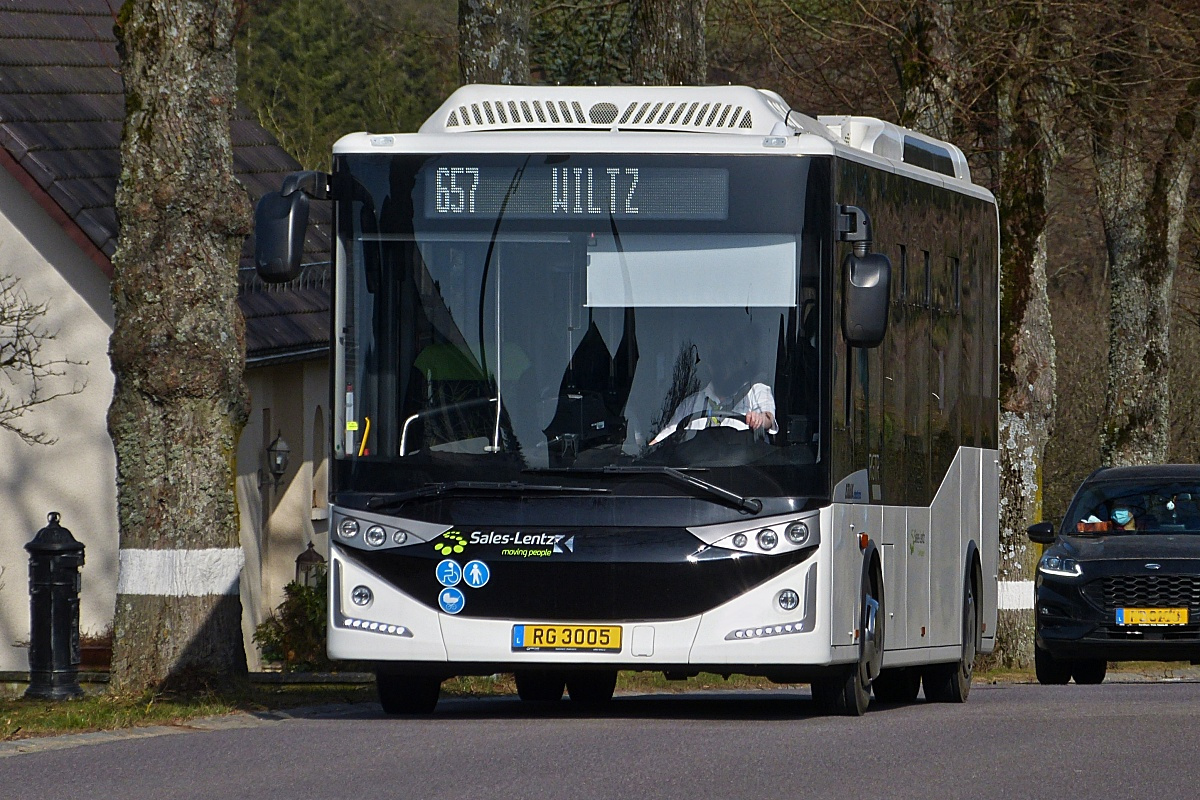 RG 3005, eBus Karsan Atak, von Sales Lentz, aufgenommen in der Nähe von Wiltz. Der Bus bediennt seit kurzem die Strecke 657 Wiltz - Dorscheid.03.2022