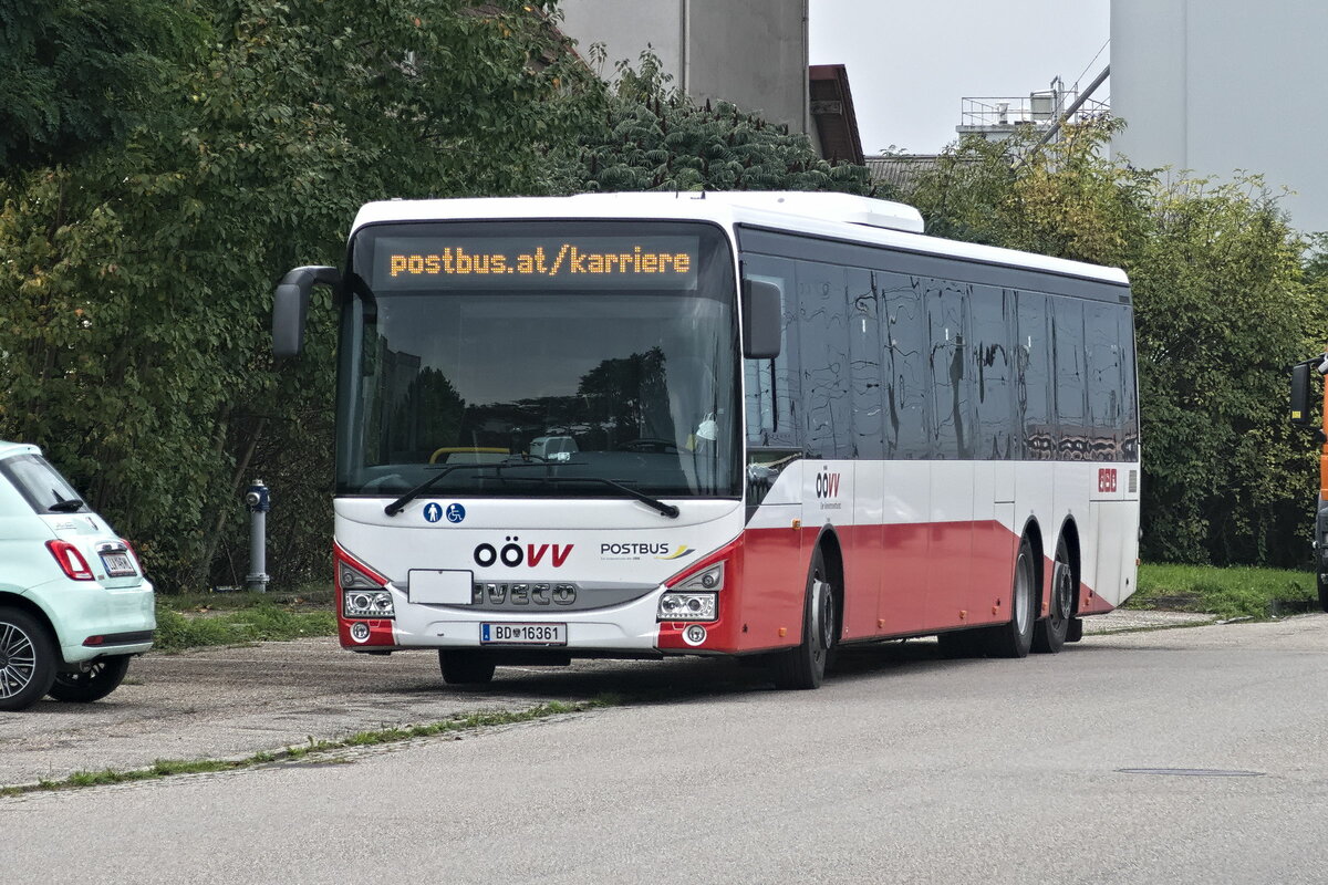 Auf das Karriereportal von Postbus verweist dieser Iveco-Irisbus Crossway (BD-16361) am Bhf. Enns. Aufgenommen 16.9.2022.