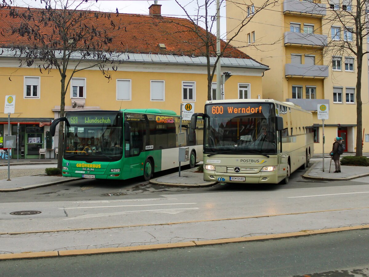 Graz. Am 23.11.2022 konnte ich am Griesplatz ein Treffen zweier Euro 5-Busse aufnehmen. Links zu sehen ist ein MAN Lion's City von Grünerbus, abfahrbereit als Linie 681 nach Wundschuh. Rechts zu sehen ist der Postbus BD 13489, der soeben als Linie 600 nach Werndorf aufbricht.