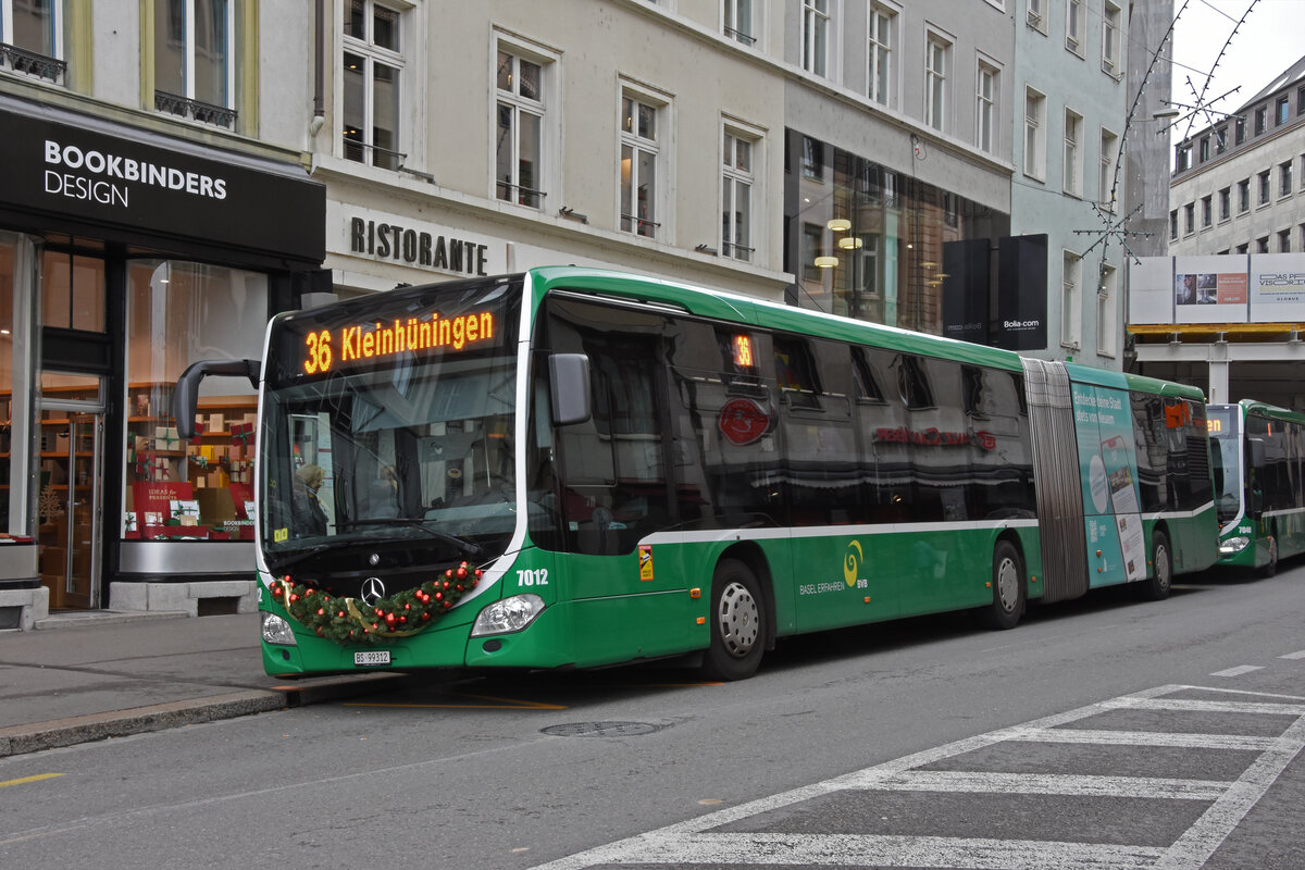 Mercedes Citaro 7012 mit einer Weihnachtsdekoration, auf der Linie 36, wartet am 30.11.2022 an der Endstation an der Schifflände.