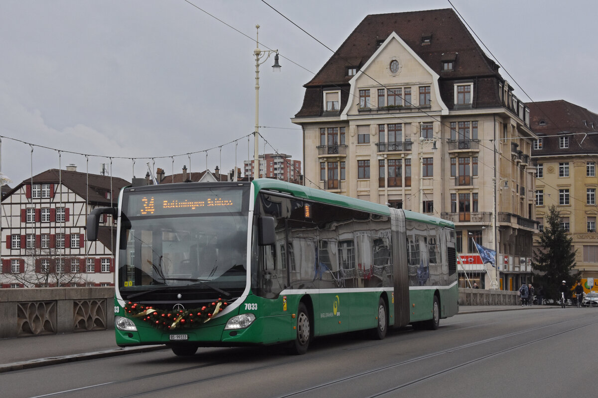 Mercedes Citaro 7033 mit einer Weihnachtsdekoration, auf der Linie 34, überquert am 30.11.2022 die Mittlere Rheinbrücke.