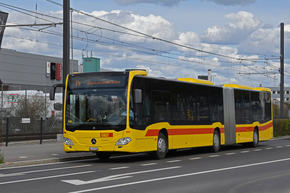 Mercedes Citaro 99 der BLT, auf der Tramersatzlinie 14, die wegen einer Grossbaustelle nicht mit Tramzügen fahren kann, bedient am 14.04.2023 die provisorische Haltestelle Lachmatt.