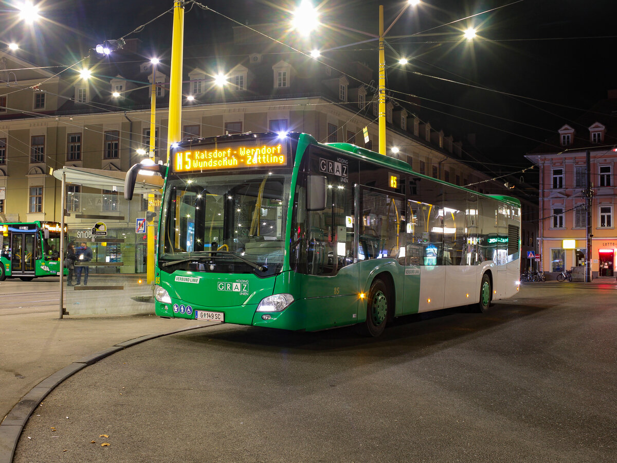 Graz. Wagen 85 der Graz Linien steht hier in der Nacht vom 17.02. auf 18.02.2023 als Linie N5 am Jakominiplatz. Der Wagen wird in Kürze nach Kalsdorf, Werndorf, Wundschuh und Zettling aufbrechen.