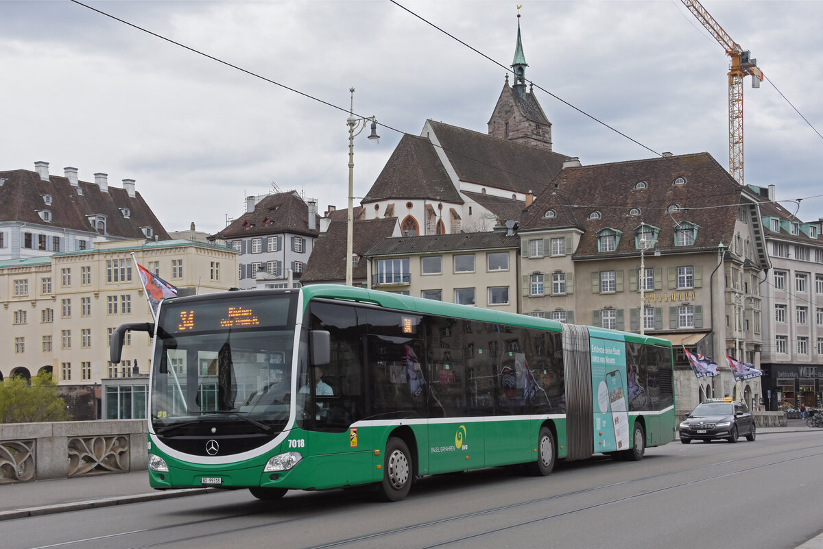 Mercedes Citaro 7018, auf der Linie 34, überquert am 12.04.2023 die Mittlere Rheinbrücke.
