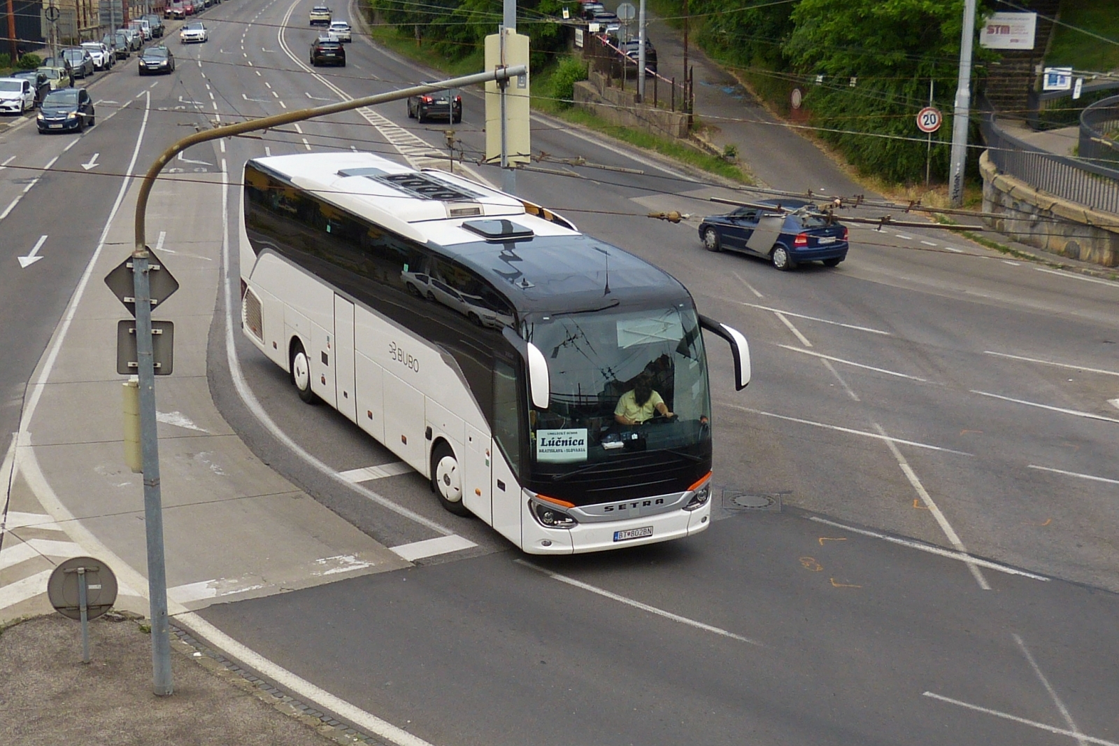 Setra S 517 HD von Blaguss, an der Haltestelle auf dem Busparkplatz Schönbrunn in Wien aufgenommen. 06.2023