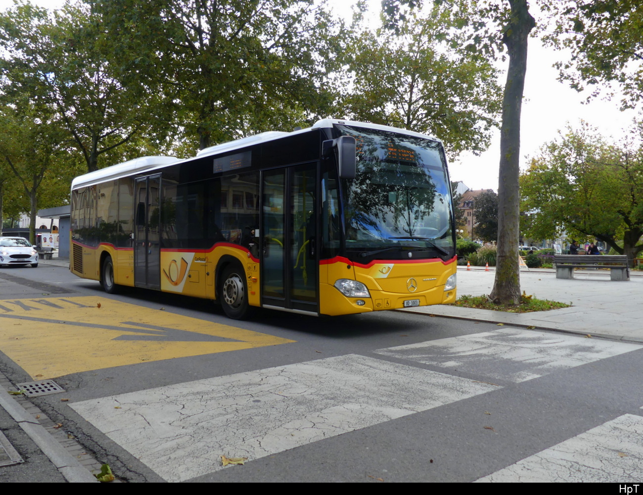 Postauto - Mercedes Citaro VD 1003 unterwegs vor dem Bahnhof in Yverdon am 21.10.2023