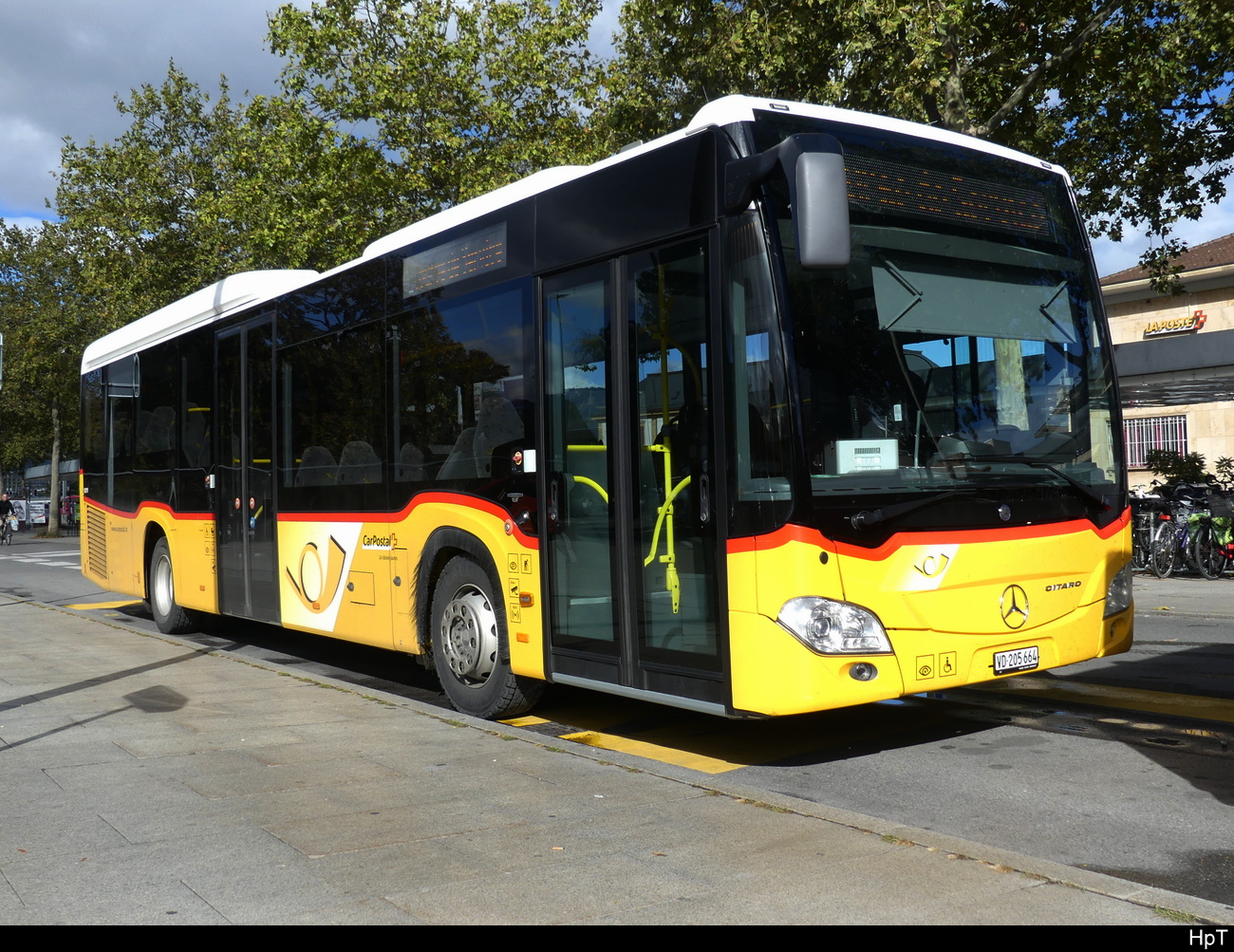Postauto - Mercedes Citaro VD 205664 auf einem Parkplatz vor dem Bahnhof in Yverdon am 21.10.2023