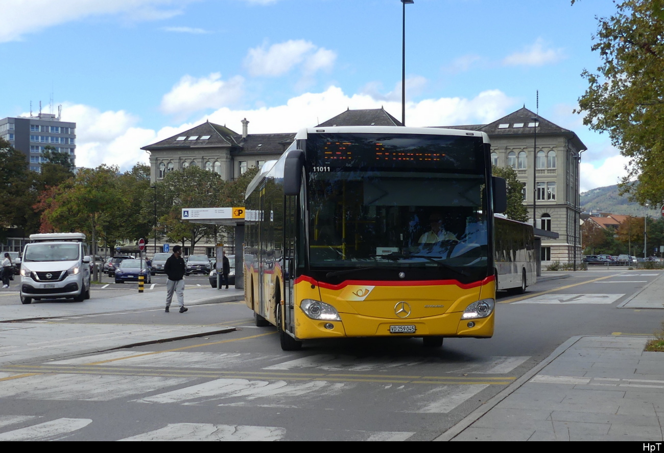 Postauto - Mercedes Citaro VD 259045 unterwegs vor dem Bahnhof in Yverdon am 21.10.2023