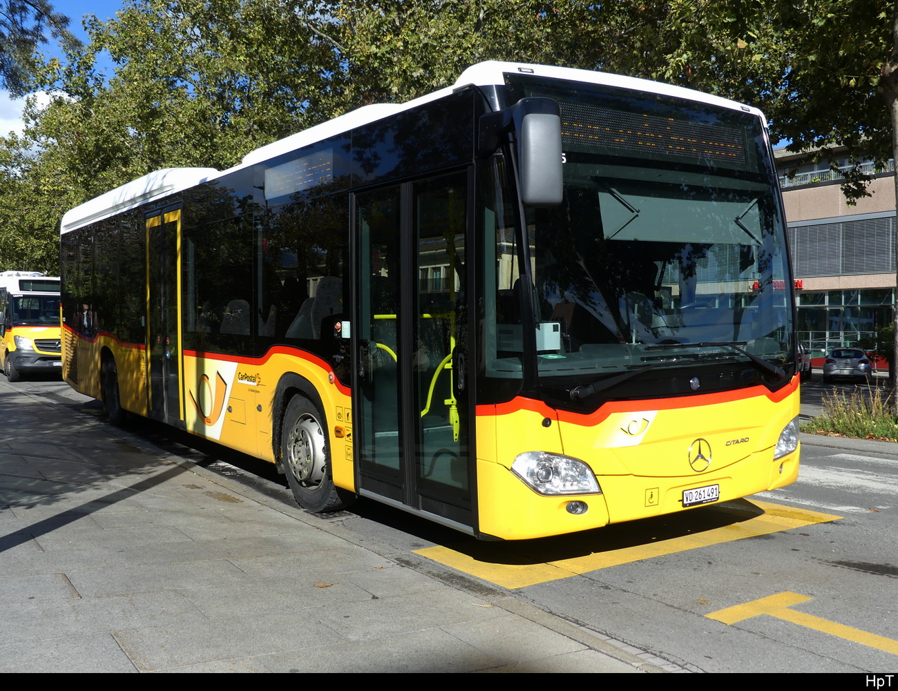 Postauto - Mercedes Citaro VD 261491 auf einem Parkplatz vor dem Bahnhof in Yverdon am 21.10.2023