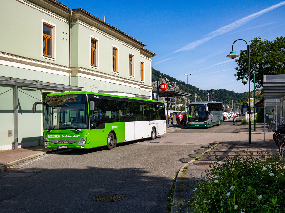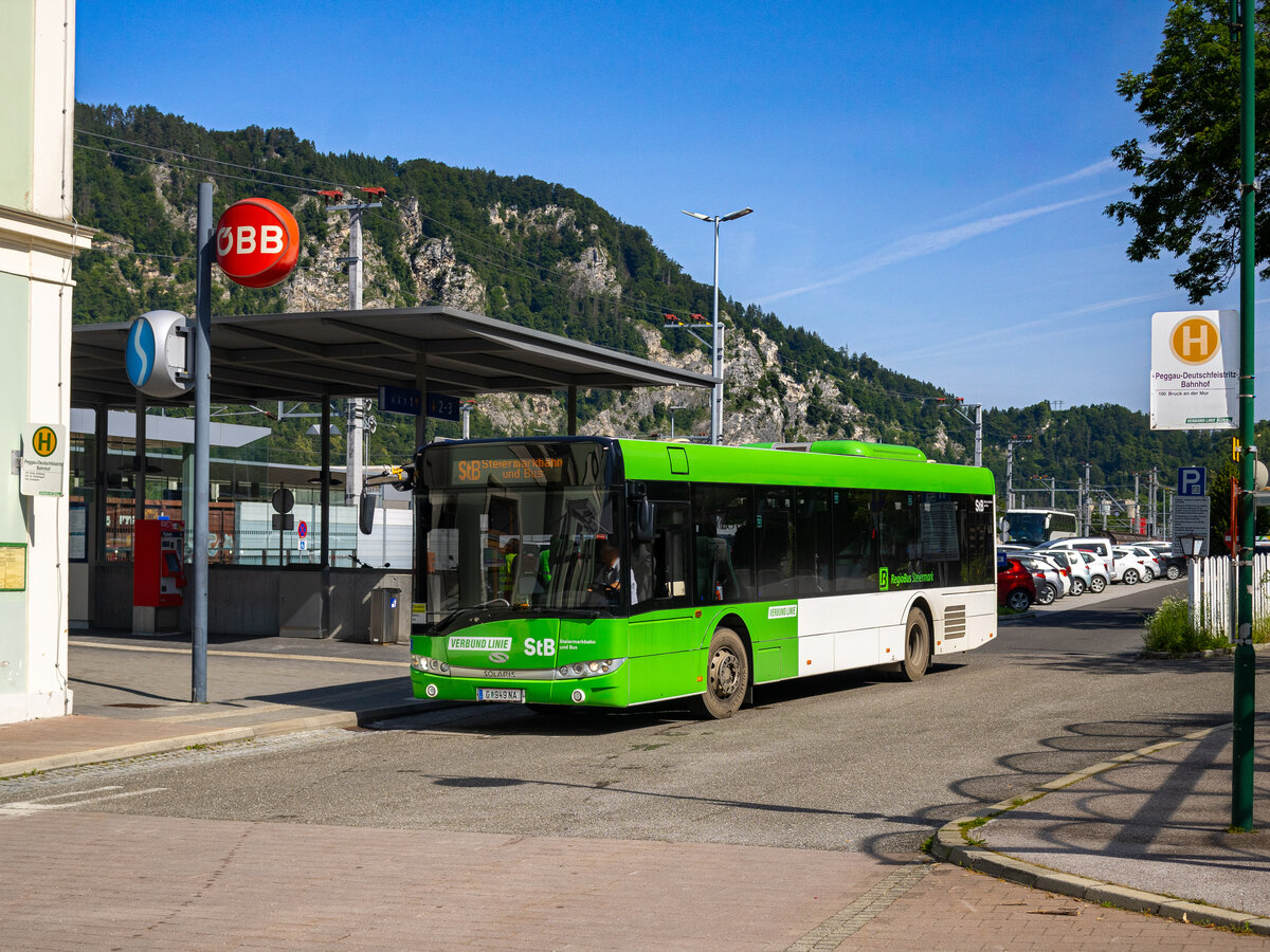Als Schienenersatzverkehr fungiert ein Solaris Urbino, hier beim Bahnhofsvorplatz Peggau.