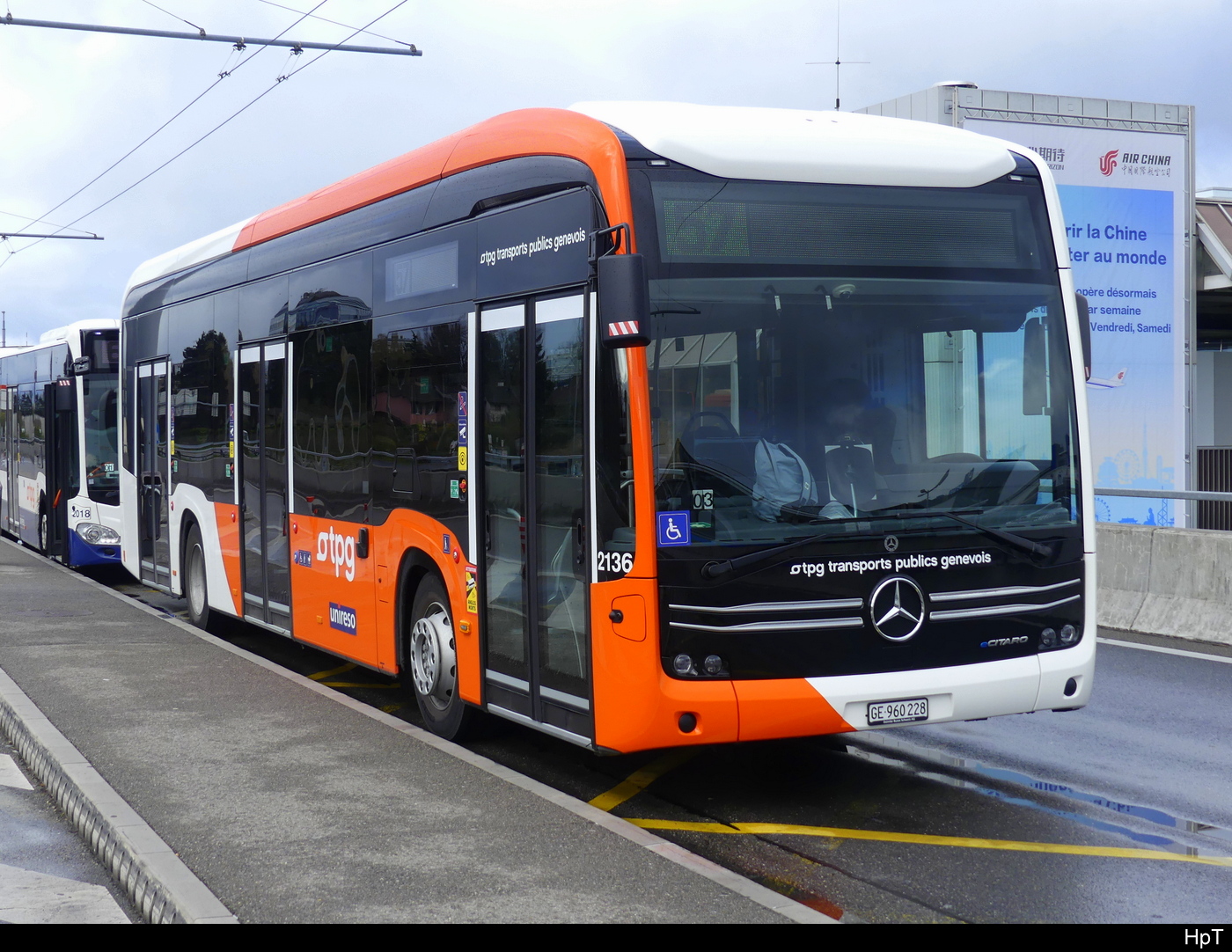 tpg - Mercedes e Citaro Nr.2136 GE 960228 bei der zufahrt zu den tpg Haltestellen vorn dem Flughafen in Genf am 24.03.2024
