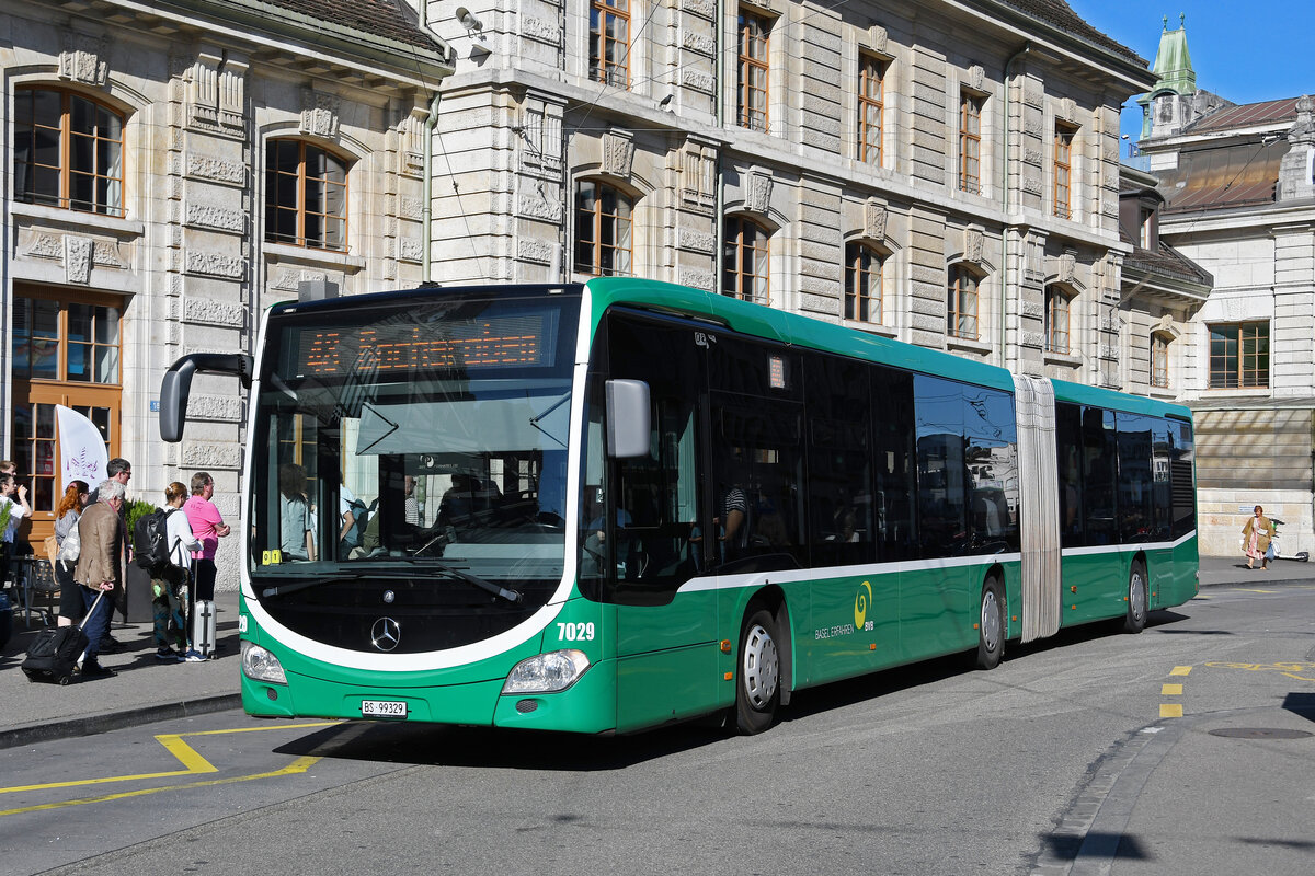 Mercedes Citaro 7029, auf der Linie 48, verlässt am 09.07.2024 die Endstation am Bahnhof SBB. Aufnahme Basel.