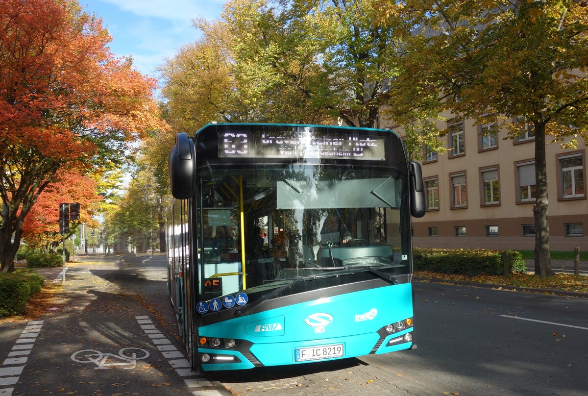 Am 08.10.2020 stoppt ein Solaris Urbino 12 der Linie 63 nach Gravensteiner Platz an der Haltestelle Frankfurt, Kaiserkronenweg. Die Bäume haben eine schöne Herbstliche Verfärbung.
